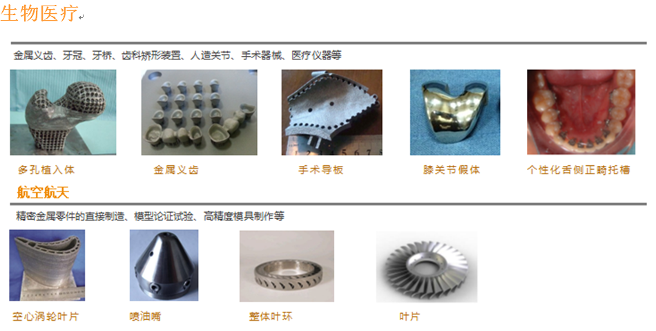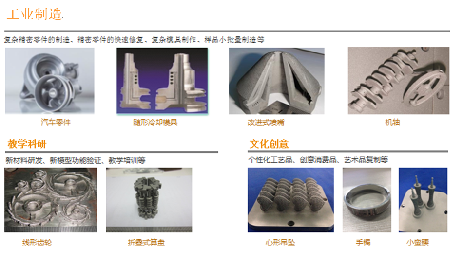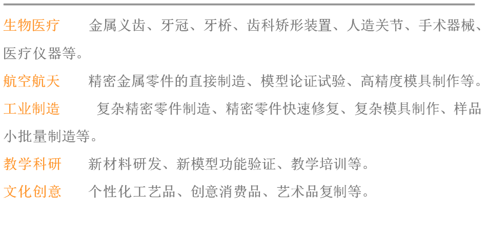 应用领域:生命医学、航空工业、船用动力、军械装备、模具、精密机械零件、工业化机械零件样品快速制造、个性化工艺品定制。