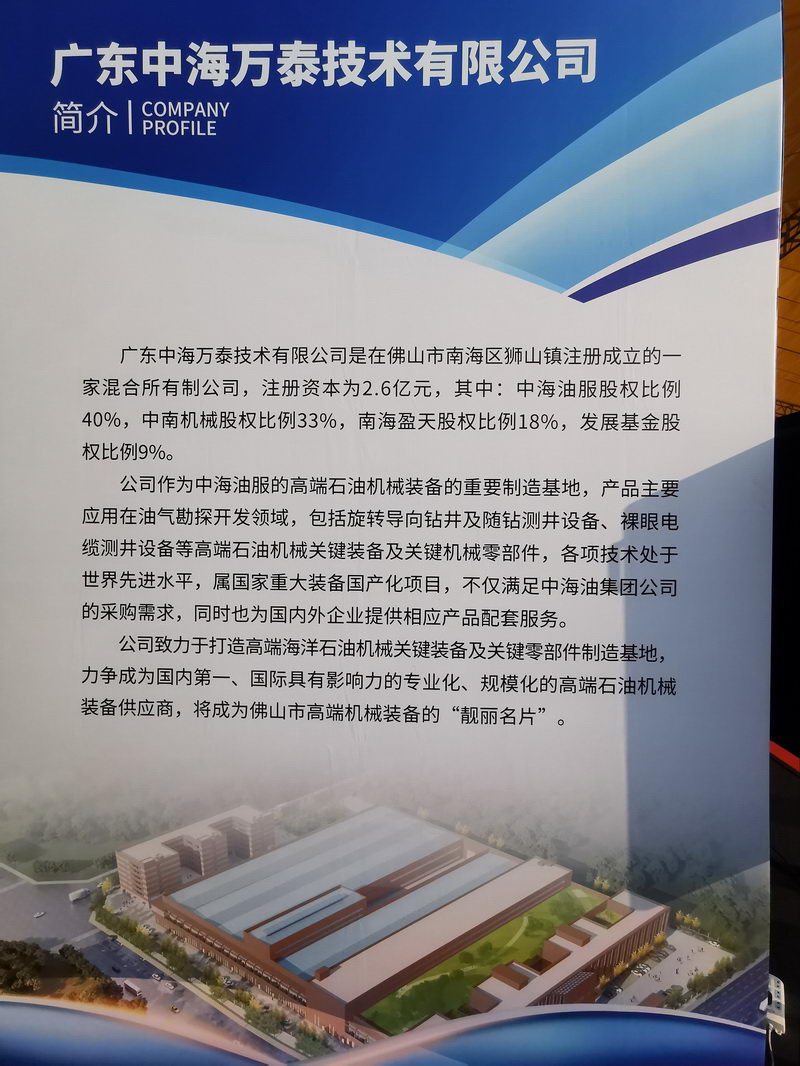 2020年11月5日,中海万泰技术有限公司(下称“中海万泰”)海洋石油高端装备(测井以及定向钻井)研发和制造基地项目在佛山市南海狮山隆重举行了奠基仪式。中海万泰是由中海油田服务股份有限公司(以下简称“中海油服”)、佛山市南海爱体育电子官网登录(以下简称“中南机械”)、佛山市南海盈天投资有限公司和佛山市产业发展投资基金有限公司共同投资建设。其中中海油服占40%的股份,中南机械占33%股份。
